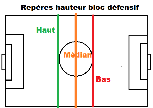 – Collectif : Hauteur du bloc pour débuter le pressing face à une attaque placée. Bloc haut= pressing des attaquants à l’extrémité haute du rond central (ligne verte). Bloc Médian = pressing des attaquants au niveau de la ligne médiane (ligne orange).Bloc bas= pressing des attaquants à l’extrémité basse du rond central (ligne rouge).