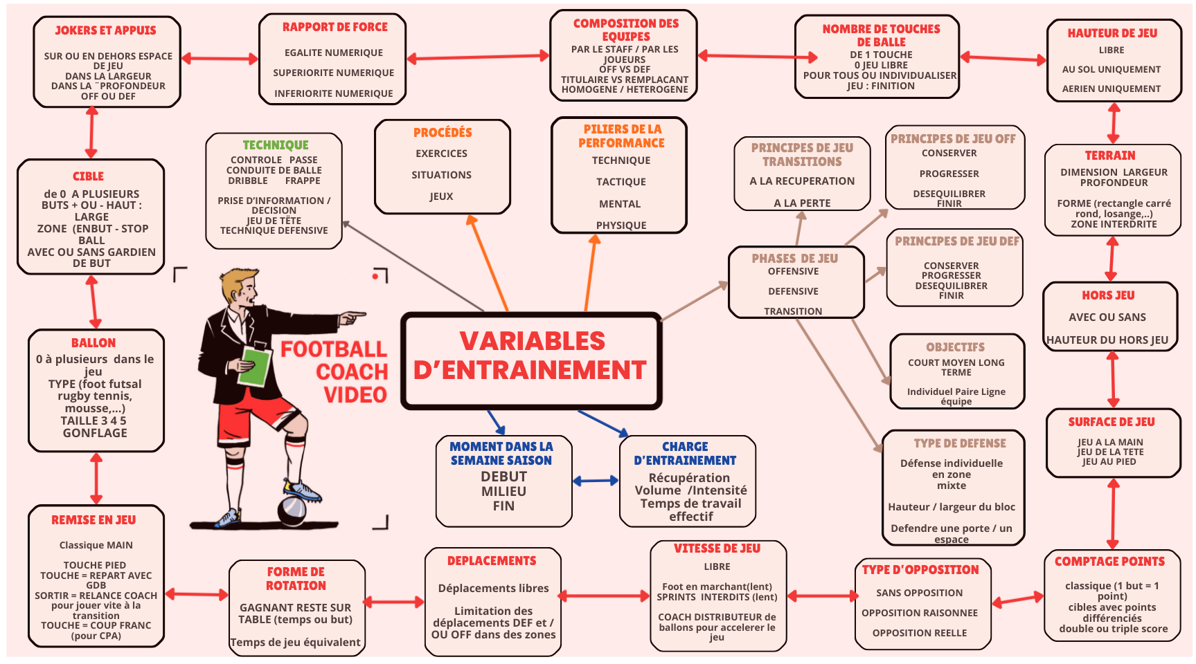 Nous vous proposons un tableau avec une large palette de variables à prendre en compte et sur lesquelles vous pourrez jouer afin de fabriquer vos exercices / situations / jeux lors de vos séances d’entrainement au football des U4 aux séniors.